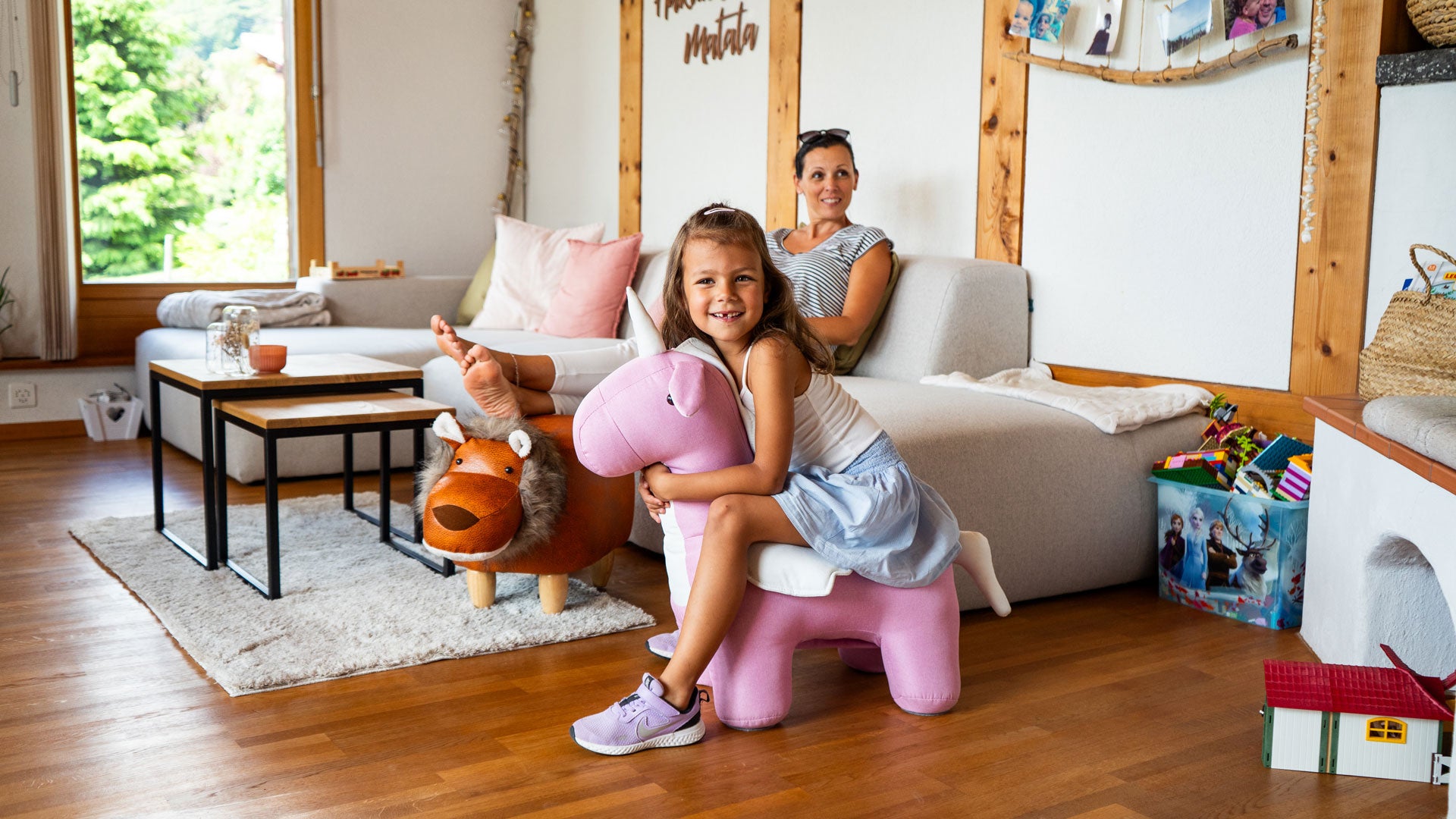 The Enea unicorn and Yuna reindeer animal stools have a compartment and can be used as storage furniture for toys, for example.